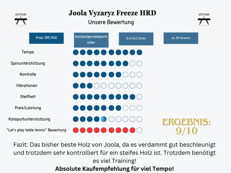 2022 kam das Joola Vyzaryz Freeze HRD auf den Markt. Es ist der inoffizielle Nachfolger des blauen Joola Vyzaryz Freeze, dass es seit 2020 gibt. Die Vyzaryz Serie ist die Premium Holzserie von Joola, die ein neues Zeitalter eingeläutet hat, nachdem Joola 2018 von den „Amis“ aufgekauft wurde. Damit verbunden war auch die Modernisierung des Logos, welches ein bisschen Ähnlichkeit zu „adidas“ hat.