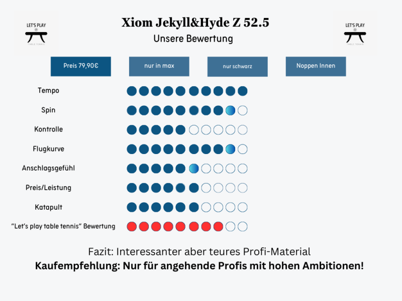 Der XIOM Jekyll & Hyde Z 52.5 ist ein absolutes Kraftpaket für offensive Spieler, die ein maximales Maß an Geschwindigkeit und Rotation suchen. Gleichzeitig macht der Belag eine Menge Freude, wenn man sein Spielstil klar nach vorne ausgerichtet hat, dann kann man wirklich unglaubliche Sachen herausholen. Wenn du aber zum variablen Offensivspiel tendierst oder gar zum Allroundspiel, dann ist dieser Belag mit großer Sicherheit die falsche Wahl.